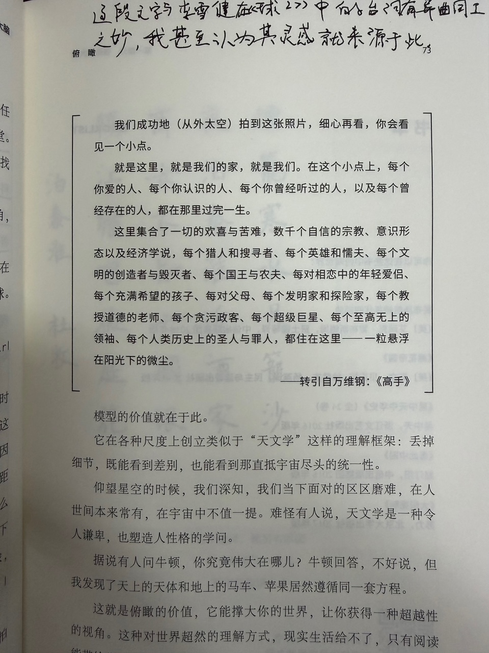 - 读这本书的时候,我喜欢拿笔在上面划线标注,有任何感受,也喜欢直接用笔把想到的写在段落旁边的空白处。我原本想这本书可以给我老婆孩子看,但想到自己在上面写的想法太过主观,或许会影响别人阅读,我甚至考虑或许应该人手一本,就像日记本一样,自己写自己的 :)